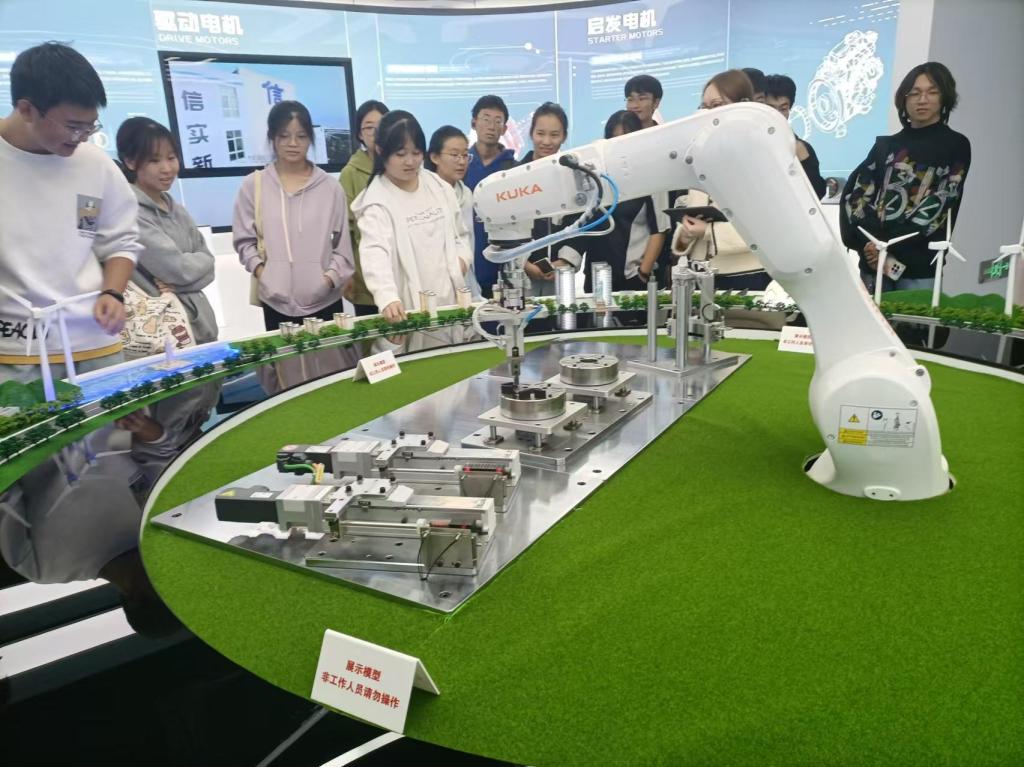 学生们参观展厅机械臂
