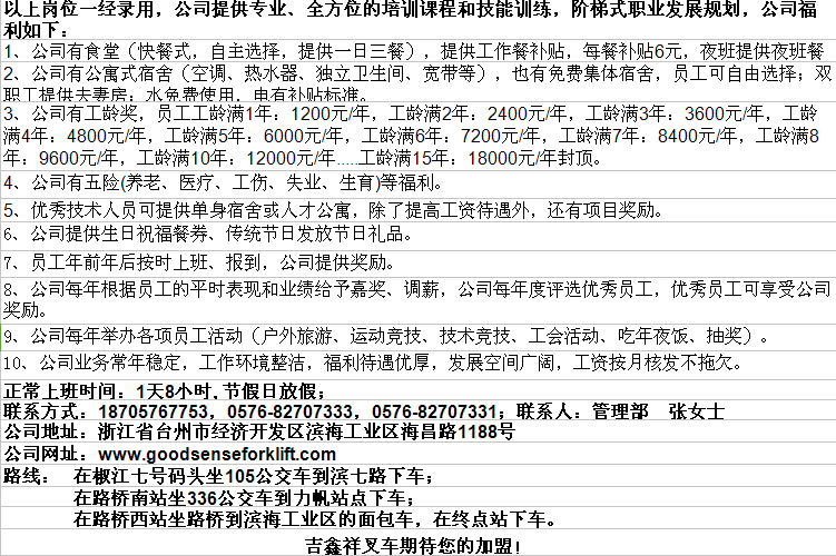 浙江吉鑫祥叉车制造有限公司为吉鑫祥集团子公司,创建于2006年,坐落在台州经济开发区滨海工业区,占地面积150余亩,厂房面积为3万平米,是专业从事叉车及物流搬运设备、航空地面设备为核心产品的现代化大型设备制造企业。经过十多年的发展,吉鑫祥拥有了行业内最齐全的内燃叉车、电动叉车、特种叉车产品链,先后开发出:1-48T内燃平衡重式叉车(国内最大吨位内燃叉车);1-12T电动平衡重式叉车(国内最大吨位电动叉车);1-12T侧面叉车(国内最大吨位侧面叉车);2-16T内燃及电动牵引车(国内最大吨位的电动牵引车);加上公司近期研发的航空地面产品(如飞机牵引车、电动行李传送车、飞机客梯车等);特种叉车(越野叉车、防爆叉车、导弹车、电站清洗车等);仓储设备(电动托盘车、前移式叉车、堆垛车等);环保设备(扫地机、洗地机、巡逻车等),形成了公司强有力的 “全系列叉车”、“航空地面设备”、“仓储搬运设备”、“电动环保设备”四大版块,已成为国内叉车研发、生产与出口基地。