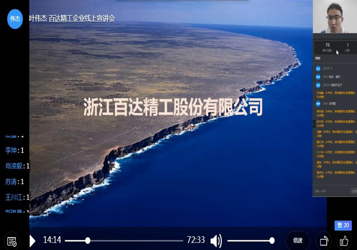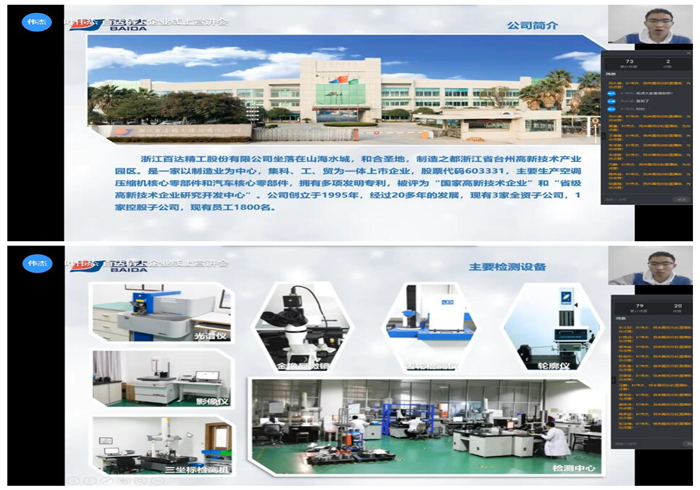 在持续一个小时的线上宣讲中,浙江百达精工股份有限公司人事部招聘专员叶伟杰分别从公司的发展历程、文化氛围、岗位需求以及面试实习相关要求等方面做了全面细致的介绍。分布在各地的航空工程学院毕业学子通过钉钉将自己关心的问题与宣讲人进行了交流,气氛十分热烈。
