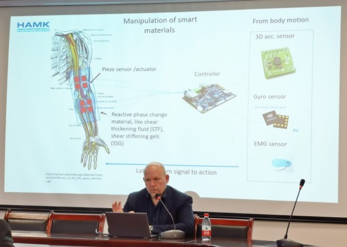 5月18日下午,芬兰HAMK大学首席科学家Kimmo Vänni受智能制造学院邀请,以《智能可穿戴外骨骼机器人技术现状及展望》为题,为学院师生作了一场精彩的学术讲座。院长陈鹏展出席并致辞,机器人与智能系统研究所副所长郑宣主持。