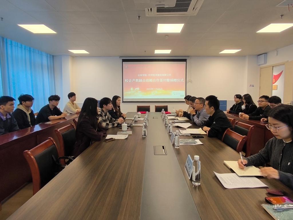 11月5日上午,台州学院-中控技术股份有限公司校企产教融合战略合作签约暨捐赠仪式在智能制造学院会议室举行。中控技术股份有限公司市场总监 胡耀文、SCADA校企合作专员孙碧徽、产品专员周昕然、智能制造学院院长陈鹏展、智能制造工程系和机电与无人机系主任、工程师学院负责人及相关专业研究生代表出席。仪式由智能制造学院副院长林树森主持。