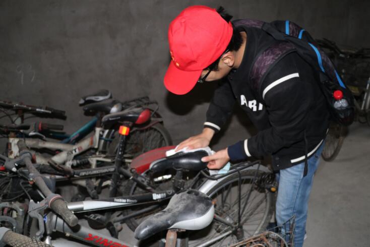 志愿者们先将车库中的自行车、电动车进行分类并擦洗干净、摆放整齐,将车库地面打扫干净。对一些陈旧车辆进行修理和翻新,并清理报废车辆。尽管天气寒冷,同学们的情绪却十分高涨,在大家的共同努力下,车库焕然一新。