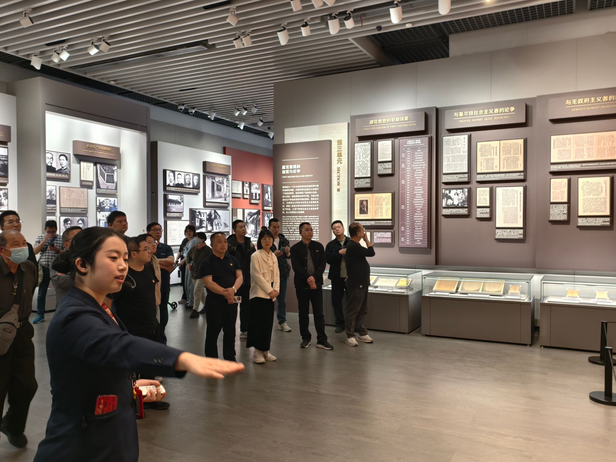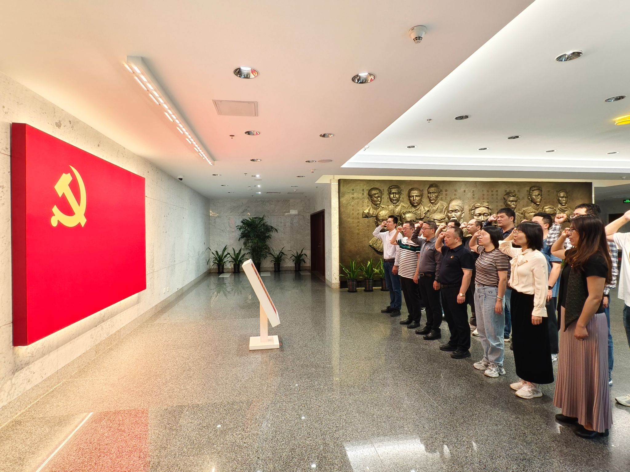 在讲解员的带领下,党员们依次参观了中共一大纪念馆五大主题展区。序厅内,十三位中共一大代表的雕塑群庄严肃穆;大型壁画前,党徽、天安门、延安宝塔等元素串联起党的光辉历程。在“前赴后继救亡图存”展区,党员们驻足凝视近代中国的苦难史,感慨先辈探索救国之路的艰辛;步入“开天辟地日出东方”展厅,通过沉浸式影像重温1921年中共一大召开的场景,南湖红船上的誓言仿佛穿越时空,激荡人心。面对展柜中陈列的《共产党宣言》早期译本、《新青年》刊物等珍贵文物,党员们纷纷举起手机记录,直言“这是一堂生动的党史课”。在宣誓厅内,学院党委书记李友富带领全体党员庄严重温入党誓词,铿锵之声回响大厅,彰显对党忠诚的永恒初心。