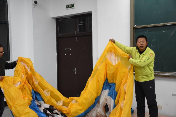 王永智总教练30多年前就开始了跳伞运动,从事滑翔伞运动也已有20多年,经验丰富,技术高超。他在讲座中介绍了滑翔伞运动的历史渊源、发展现状、装备结构、操控原理、赛事类型、发展前景等,通过现场演示滑翔伞实物,讲解滑翔伞伞具的材质构造、动力原理,在回顾亲身经历、描述滑翔体验过程中,向师生们展示了滑翔伞运动的独特魅力和人类挑战自我、崇尚自由、翱翔蓝天,体现“更快、更高、更强”体育精神的不懈追求,引起师生们的广泛共鸣。互动环节,师生们还就自己感兴趣的问题与王教练作了具体、深入的交流和探讨。