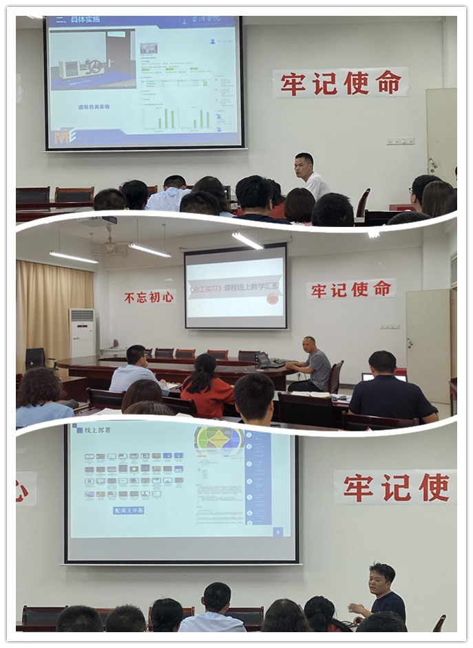 会上,徐锋、裘钧、郑宣等三位教师分别作《线上线下混合式课程改革与项目申报--以“材料力学”为例》、《金工实习课程线上教学汇报》、《互联网+教学中专业英语(机械工程)的实践探索》汇报,将自己在“互联网+教学”过程中的经验与大家进行了分享,重点介绍了“互联网+教学”背景下以成果为导向的课程教学与改革、如何利用线上+线下的混合式资源建设申报教研教改课题、实践课程线上教学实施过程,以及如何打造以学生为主体的线上课堂等内容。