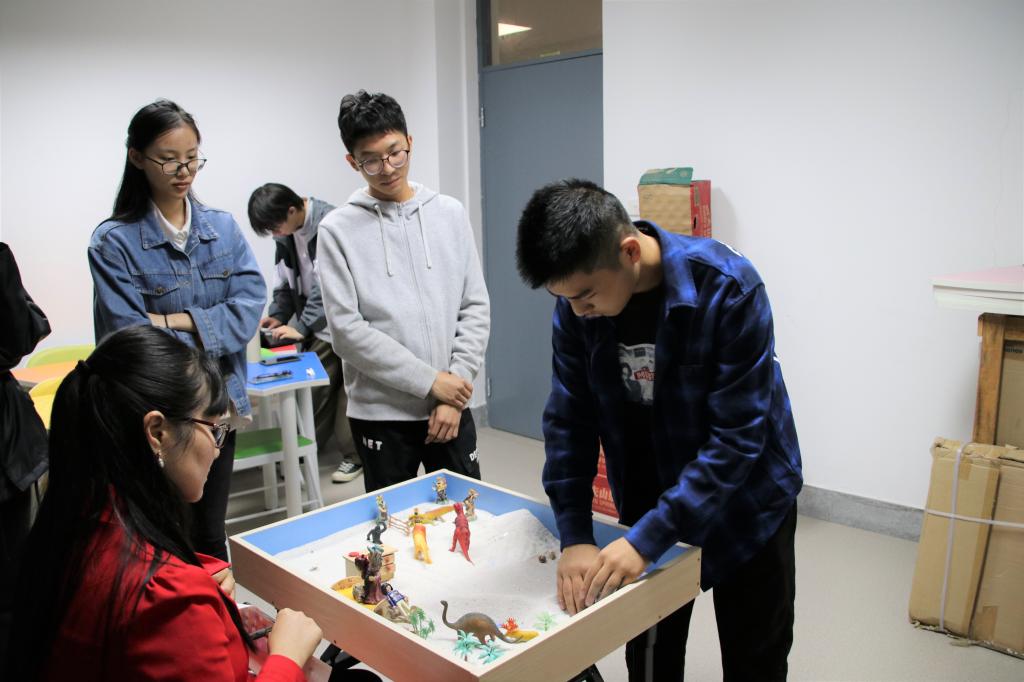梅娇老师向参加活动的同学们说明游戏规则后,同学们迅速被玲琅满目的沙盘摆件深深吸引,迫不及待地要将自己喜欢的各类摆件摆在沙盘上,共同协作来完成理想的图画。游戏结束后,同学们围坐一圈,说出各种天马行空的理由,气氛热烈而轻松,梅娇老师通过沙盘游戏,揭示同学们奇妙的内心世界。