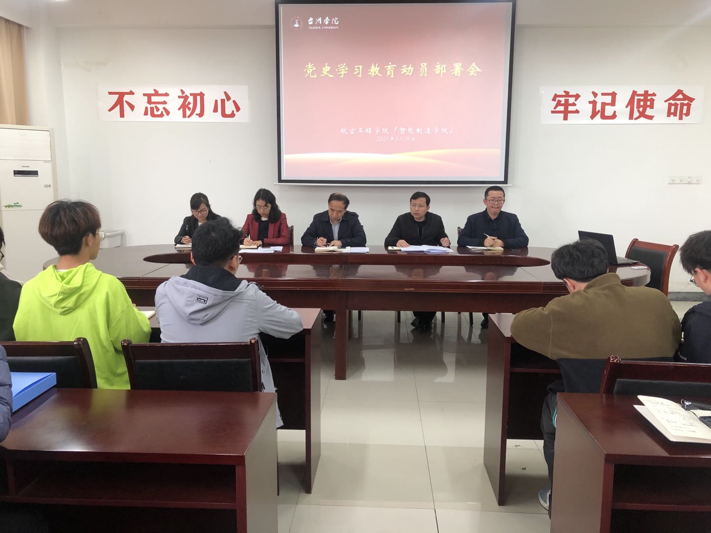 3月18日下午,航空工程学院在B201会议室召开党史学习教育动员部署大会,学院党政领导班子、全体教师以及学生党员代表参加了会议。