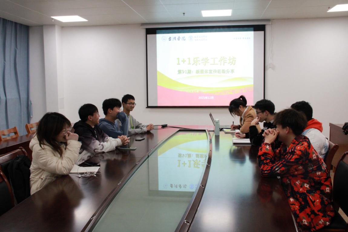 2021年12月1日傍晚,航空工程学院(智能制造学院)在航空楼S501教室举行以“新媒体宣传经验分享”为主题的“1+1乐学工作坊”活动。学院辅导员王越担任活动导师,航空团学会宣传部成员参加。