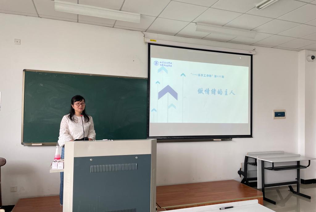 6月13日上午,智能制造学院在五号教学楼举行“1+1乐学工作坊”第157期活动,以“做情绪的主人”为主题。学院党委副书记梅娇担任本期“1+1乐学工作坊”导师,学生代表30余人参加本次活动。