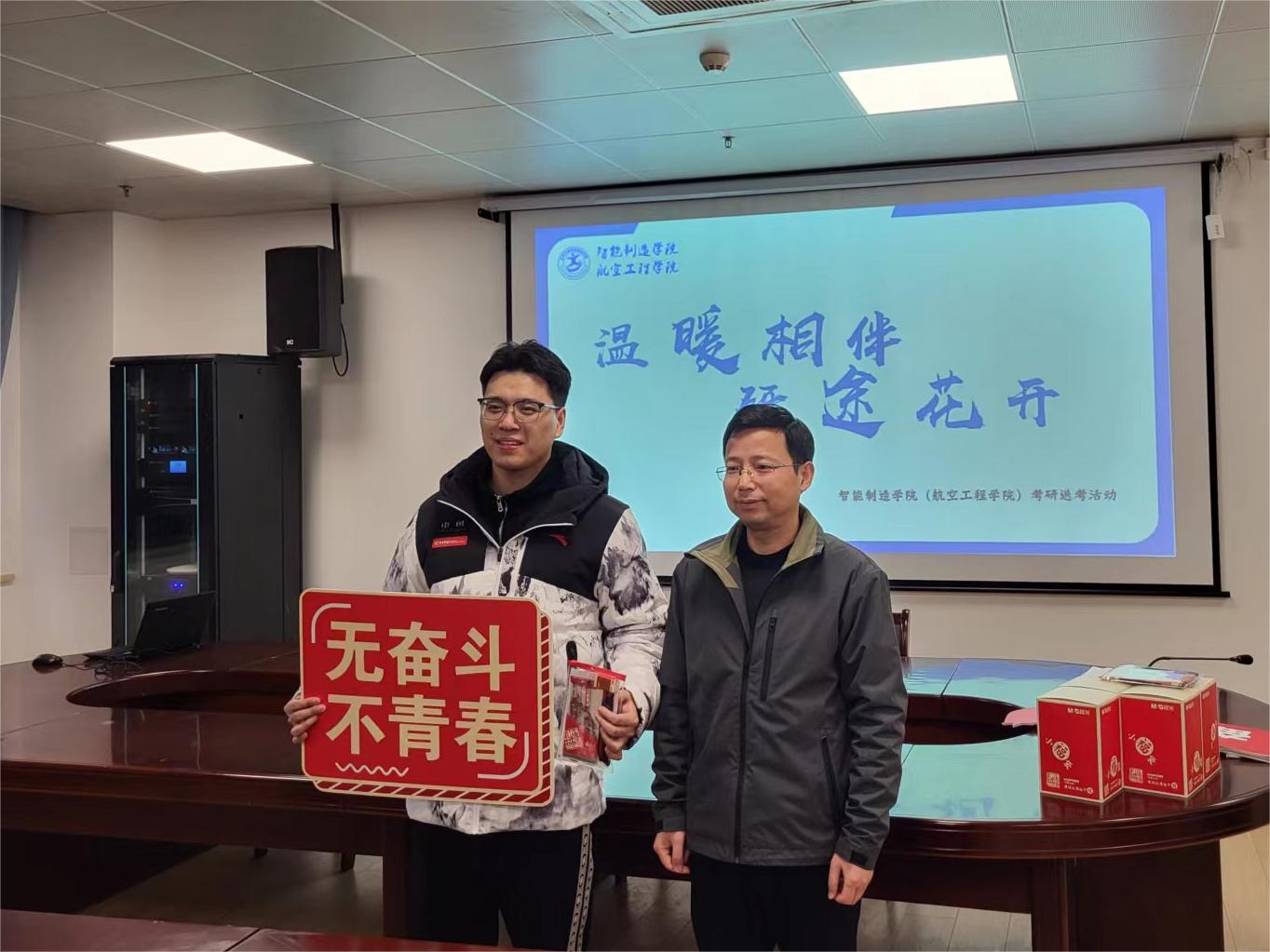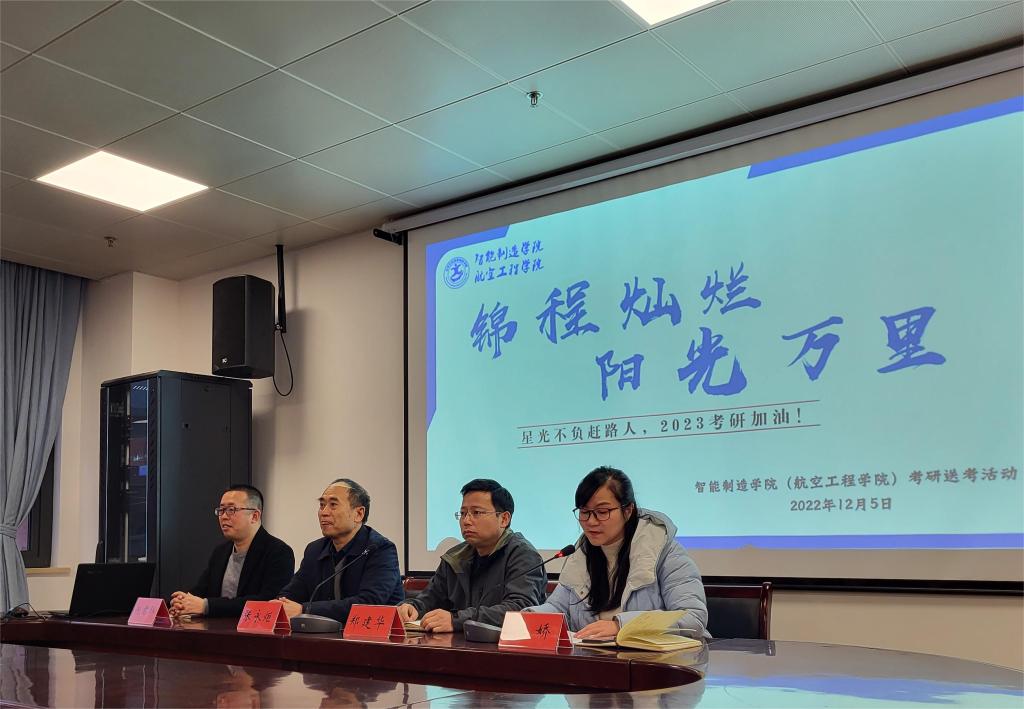 为缓解考研学生复习压力,增强迎考信心。12月5日下午,智能制造学院(航空工程学院)在航空楼S510会议室举行“锦程灿烂,阳光万里”考研送考活动,即“研途有你,一起向未来”第六期伴航活动。本次活动由学院党委副书记梅娇主持,院长张永炬、党委书记郑建华、副院长倪君辉出席并致辞,辅导员刘湘、周铖杰及全体考研学生参加。