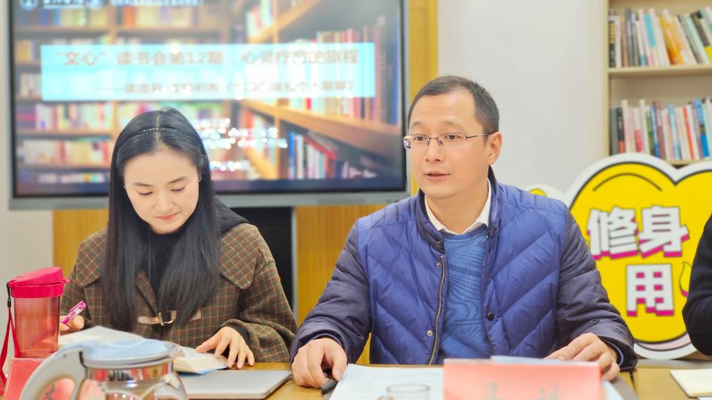 12月8日早上,“文心”读书会第12期活动:心灵疗愈的旅程——读洛莉·戈特利布《也许你该找个人聊聊》,在椒江校区心湖书吧举行。校学工部副部长马斌、人文学院党委副书记林仙、医药化工学院党委副书记刘贵花、心理中心专职心理咨询师、辅导员参会。读书会由智能制造学院党委副书记、“雪绒花”心理工作室负责人梅娇主持。