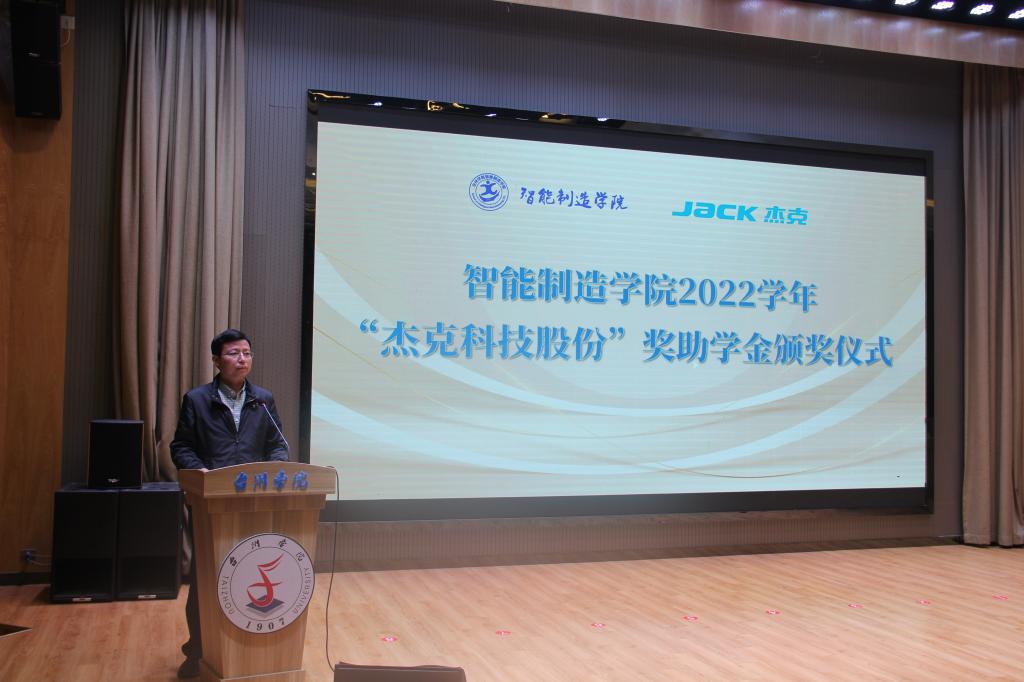 4月6日下午,智能制造学院2022学年“杰克科技股份”奖助学金捐赠暨颁奖仪式在椒江校区学生活动中心隆重举行。杰克集团副总裁阮振华,校地方合作处副处长郑晓莉,校学工部副部长王林军出席,学院党政领导班子、辅导员、教师及学生代表参加。仪式由学院党委书记郑建华主持。