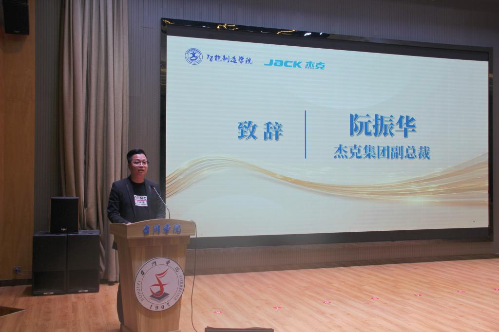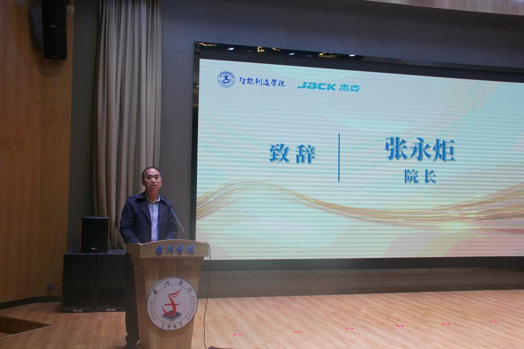 张永炬代表学院全体师生向杰克科技股份有限公司的慷慨捐赠表示衷心感谢,他表示今后要进一步加深校企合作关系,推动产教融合,实现教育和发展的双赢!并对获奖学生提出三点勉励希望,一要知事明理,厚植家国情怀。二要知行合一,锻造过硬本领。三要常怀感恩,积极回馈社会,用实际行动服务企业,回馈社会。阮振华副总裁在致辞中表示多年来学校的课程质量、教学水平一直在社会上享有很高的声誉,简要介绍了公司的发展情况和未来规划,勉励同学们要珍惜在学校的学习机会,发挥专业特长,依托校企共建机制,共谋台州缝纫设备发展。