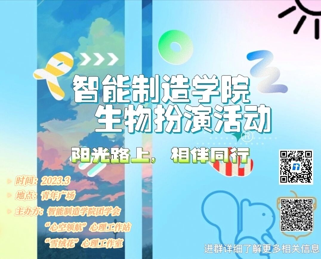 3月25日下午,智能制造学院在青年广场举行“阳光路上·相伴成长——生物扮演”心理健康教育活动。本次活动由“心空领航”心理工作站、“雪绒花”心理工作室主办,智能制造学院团学会心理与艺术中心承办,各二级学院同学热烈响应,积极参与。