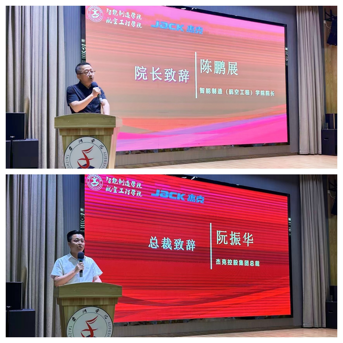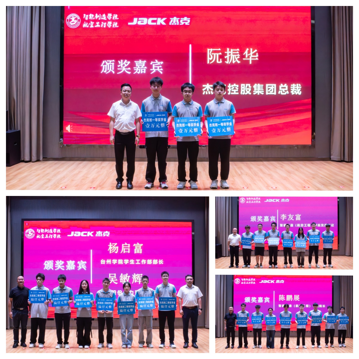 盛典在《我的未来式》演唱中拉开序幕。智能制造学院院长陈鹏展、杰克控股集团总裁阮振华先后致辞。院长陈鹏展在致辞中向杰克集团致谢,回顾2022年双方联合设立“杰克班”,通过“专业基础+真实案例+行业特色”课程体系与校企协同模式培养学生,强调将深化与杰克在多领域合作、构建产教融合生态,并寄语学子融入国家制造强国建设。杰克控股集团总裁阮振华祝贺获奖学生,寄语学生坚守理想、深耕专业、敢于突破、知行合一,并表示杰克将持续与学院深化合作,共建实训基地,推进产学研项目,开展师资交流与人才共育,助力学院高质量发展。
