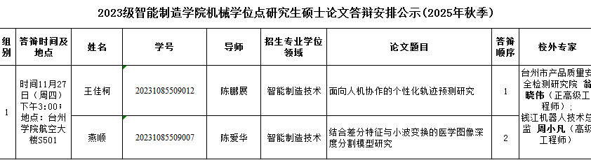 2023级智能制造学院机械学位点研究生硕士论文答辩安排公示(2025年秋季)
