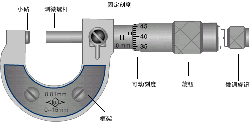 测量时,当小砧和测微螺杆并拢时,可动刻度的零点若恰好与固定刻度的零点重合,旋出测微螺杆,并使小丰和测微螺杆的面正好接触待测长度的两端,那么测微螺杆向右移动的距离就是所测的长度。这个距离的整毫米数由固定刻度上读出,小数部分则由可动刻度读出。