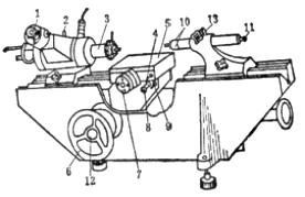 (5)移动尾管10(11是尾管的微调螺钉),同时转动工作台横向移动手轮7,使测钩的内测头在标准环端面上刻有标线的直线方向或量块组的侧块上接触,用紧固螺钉13锁紧尾管;然后用手扶稳测量轴3,挂上重锤,并使测量轴上的测钩内测头缓慢地与标准环或侧块接触。