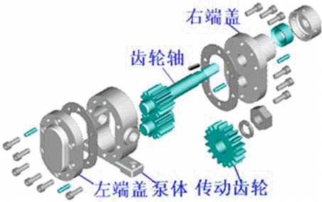 工作原理:齿轮泵是各种机械润滑和液压系统的输油装置。用来给润滑系统提供压力油的。主要用于低压或噪声水平限制不严的场合。齿轮油泵一般由一对齿数相同的齿轮、传动轴、轴承、端盖和壳体组成。如图所示,当主动齿轮逆时针转动,从动齿轮顺时针转动时,齿轮啮合区右边的压力降低,油池中的油在大气压力作用下,从进油口进入泵腔内。随着齿轮的转动,齿槽中的油不断沿箭头方向被轮齿带到左边,高压油从出油口送到输油系统 。