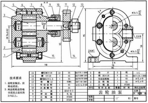 油泵的装拆顺序:拆螺钉 、销钉 → 左端盖 → 齿轮轴→螺母及垫圈→齿轮→压盖螺母、压盖及密封圈→右端盖→齿轮轴。 学生分组进行,动手拆卸装配件(齿轮油泵)。拆卸过程中要记录拆卸零件的次序、名称,观察分析零件之间的装配位置和装配关系,全面详细地掌握齿轮油泵总体构造和各个零件形状特征及其表面特征(加工面与非加工面,配合面与非配合面)。机件的配合表面应注意保护,防止损伤,零件切勿丢失,最后应装配后归还。