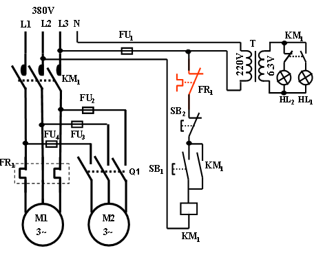 6、改进电气线路,使电机M2也用按钮、交流接触器来控制,画出改进后的电气线路并接线验证。