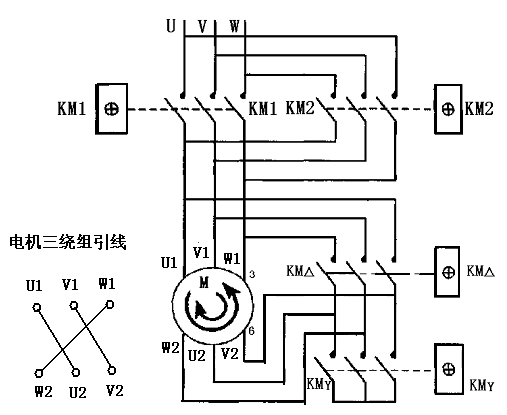 2) 当按下SB2按钮时,KM2、KMY线圈通电,电机Y联接反转起动,过5S后,KM2、KM△线圈通电,电机转为△联接反转运行。