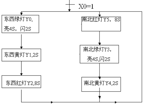 开关X0合上后,东西方向:绿灯Y0亮4s后闪2s灭→黄灯Y1亮2s灭→红灯Y2亮8s→绿灯亮…… 如此循环;对应东西绿、黄灯亮时南北红灯Y5亮,对应东西红灯亮时,南北绿灯Y3亮4S→闪2秒灭→南北黄灯Y4亮2S后,……如此对应循环。开关X0断开后,所有灯灭。具体见下面流程图