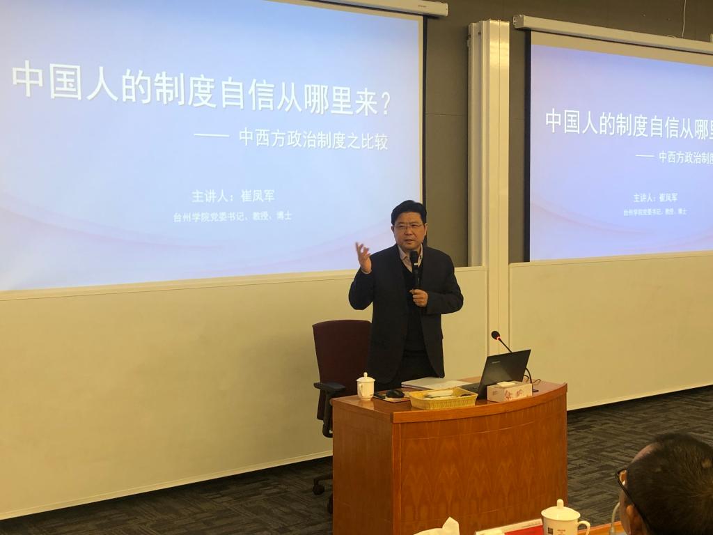 崔凤军书记首先为大家简要介绍了道路自信、理论自信、制度自信、文化自信的基本涵义,接着从中西方政治制度进行比较,旁征博引、深入浅出,深刻剖析了中外政体制度和功能运作。他指出,一个国家选择什么样的治理体系,是由这个国家的历史传承、文化传统、经济社会发展水平决定的,是由这个民族的人民决定的。他以中华传统文化为切入点,通过大量事例,将中西方文史哲经典融会贯通、纵横比较,阐述了独特的中国文化具有强大的融合能力。