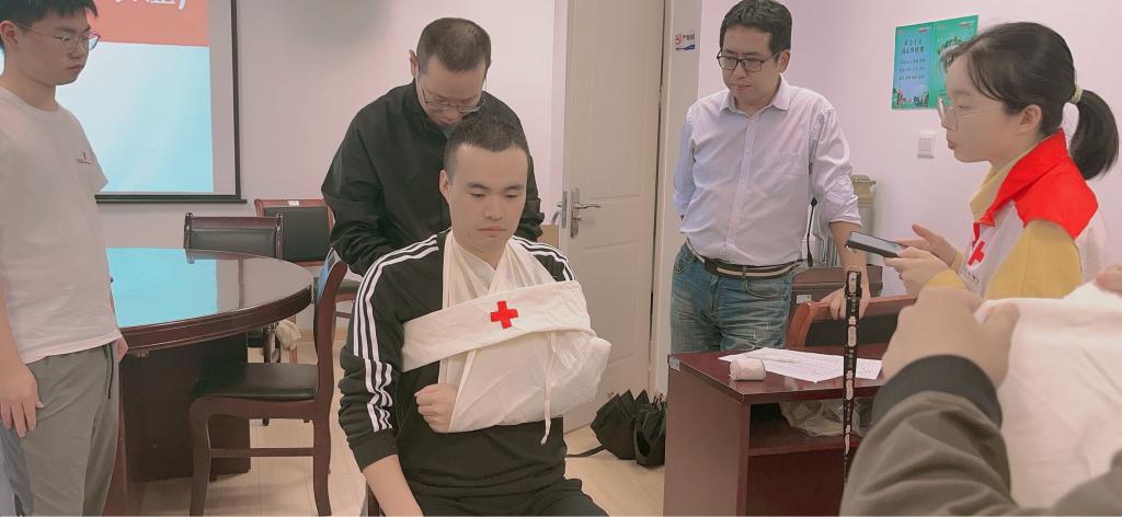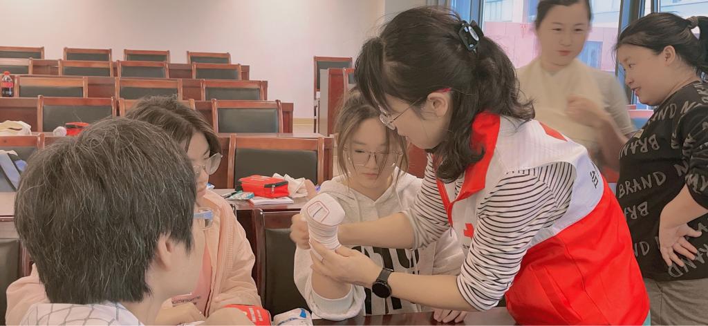 此外,张宁老师还演示了如何进行应急包扎处理,包括伤口的清洁、包扎技巧及止血方法。培训过程中,参与师生纷纷仔细学习,认真练习,认真考试。