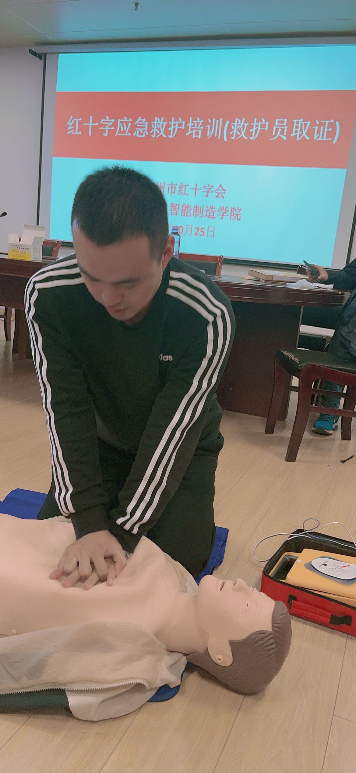 为了增强学院教师及学生的应急处理能力,智能制造学院于2024年10月25日联合红十字会举办了一场应急救护培训及救护员考证活动。此次活动吸引了众多师生参与,重点围绕AED使用、心肺复苏和应急包扎处理等内容展开。