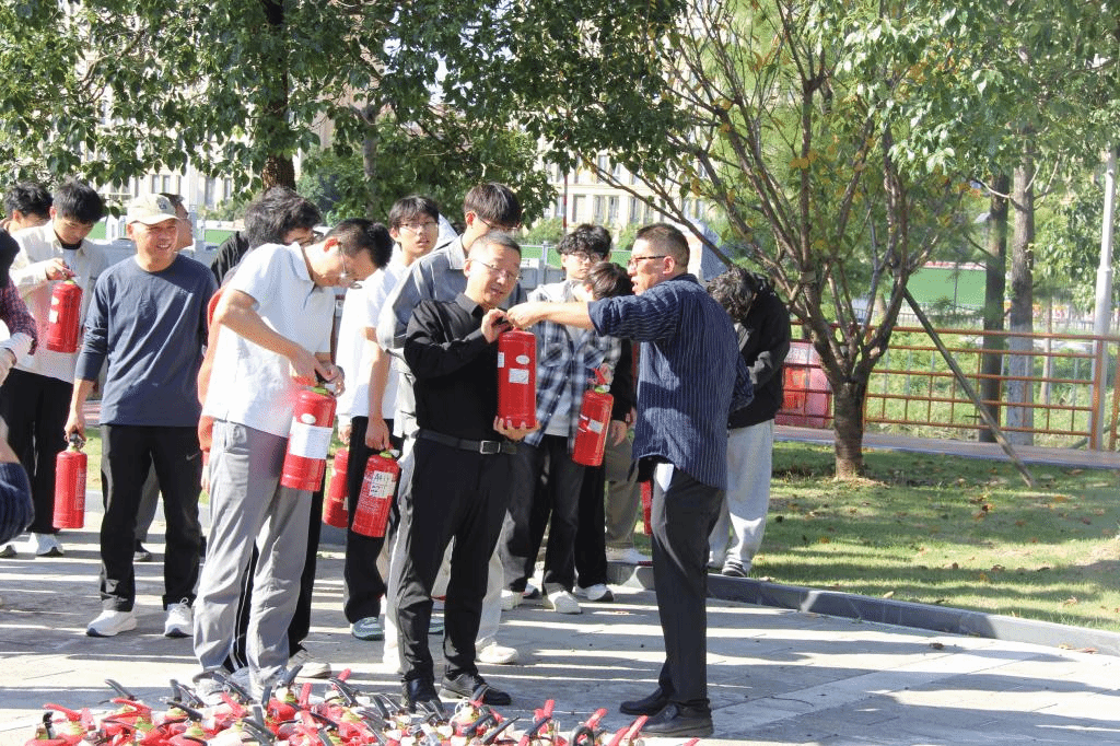 人员全部安全疏散至集结地点后,保卫处专业人员为全体参演师生进行了灭火器使用方法的现场教学与实操培训。专业人员详细讲解了干粉灭火器的构造、工作原理、操作要点及注意事项,并进行了标准示范。在认真聆听和观摩后,师生们踊跃参与,分批上前进行了灭火器实操演练。大家按照“提、拔、握、压”的动作要领,对准模拟火源进行喷射,成功将“火焰”扑灭,在实践中掌握了灭火器材的正确使用方法。
